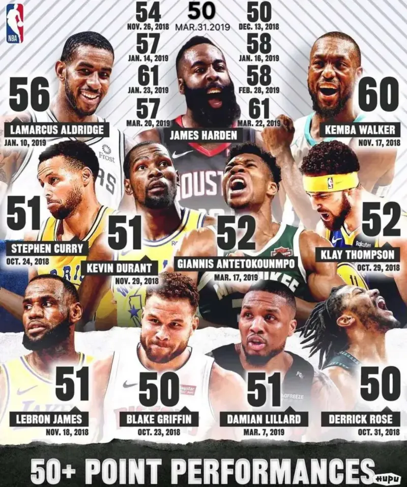 2018-19赛季西部半决赛对阵勇士,大比分0-2落后,哈登第三场砍下41分9篮板6助攻。第四场砍下38分10篮板。大比分硬生生扳回来。