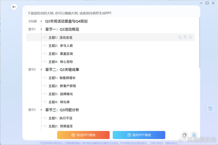 • 体验:我打开它的“AI PPT”功能,输入主题“Q3市场活动复盘与Q4规划”,并选择了一个商务模板。